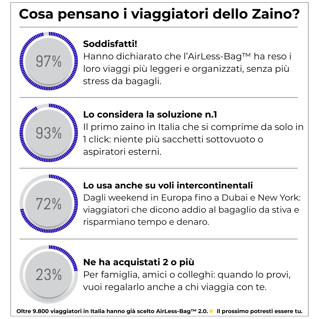 Viaggia con il 50% in più dei tuoi oggetti personali eliminando lo scomodo bagaglio da stiva!