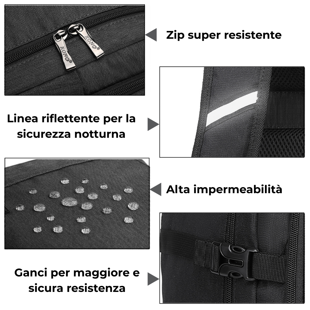 Lo Zaino Kono custodisce i tuoi oggetti più preziosi nella tasca di sicurezza nascosta, mentre il tessuto impermeabile ti protegge da pioggia e sorprese.
