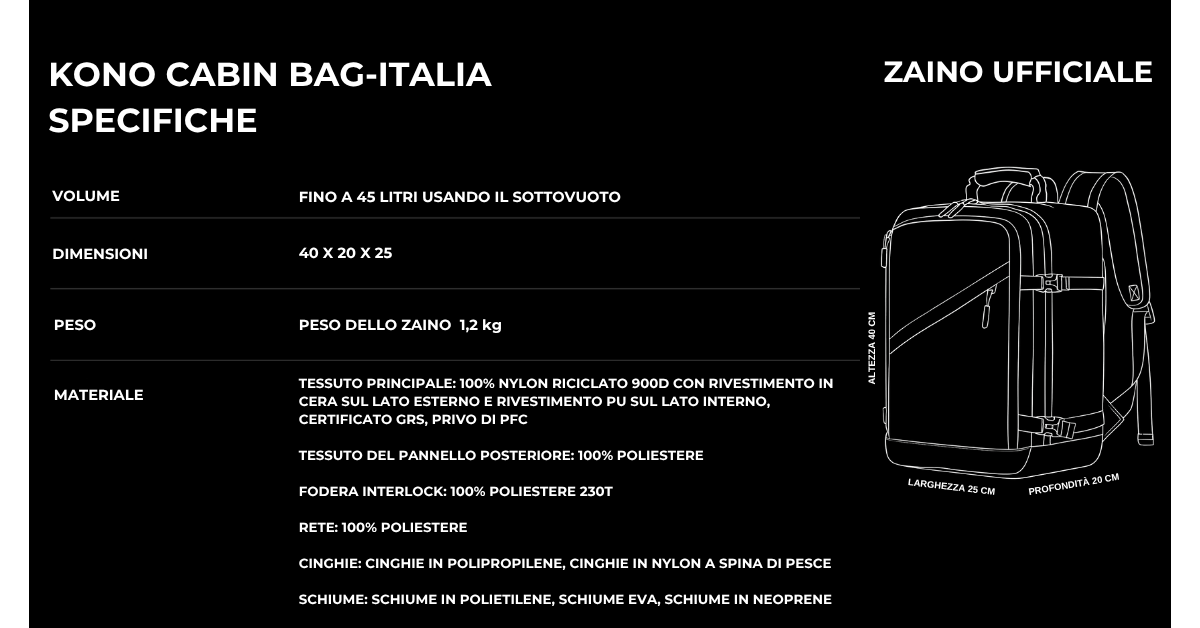 Kono cabin bag - 40x20x25 Zaino Sottovuoto Approvato Ryanair